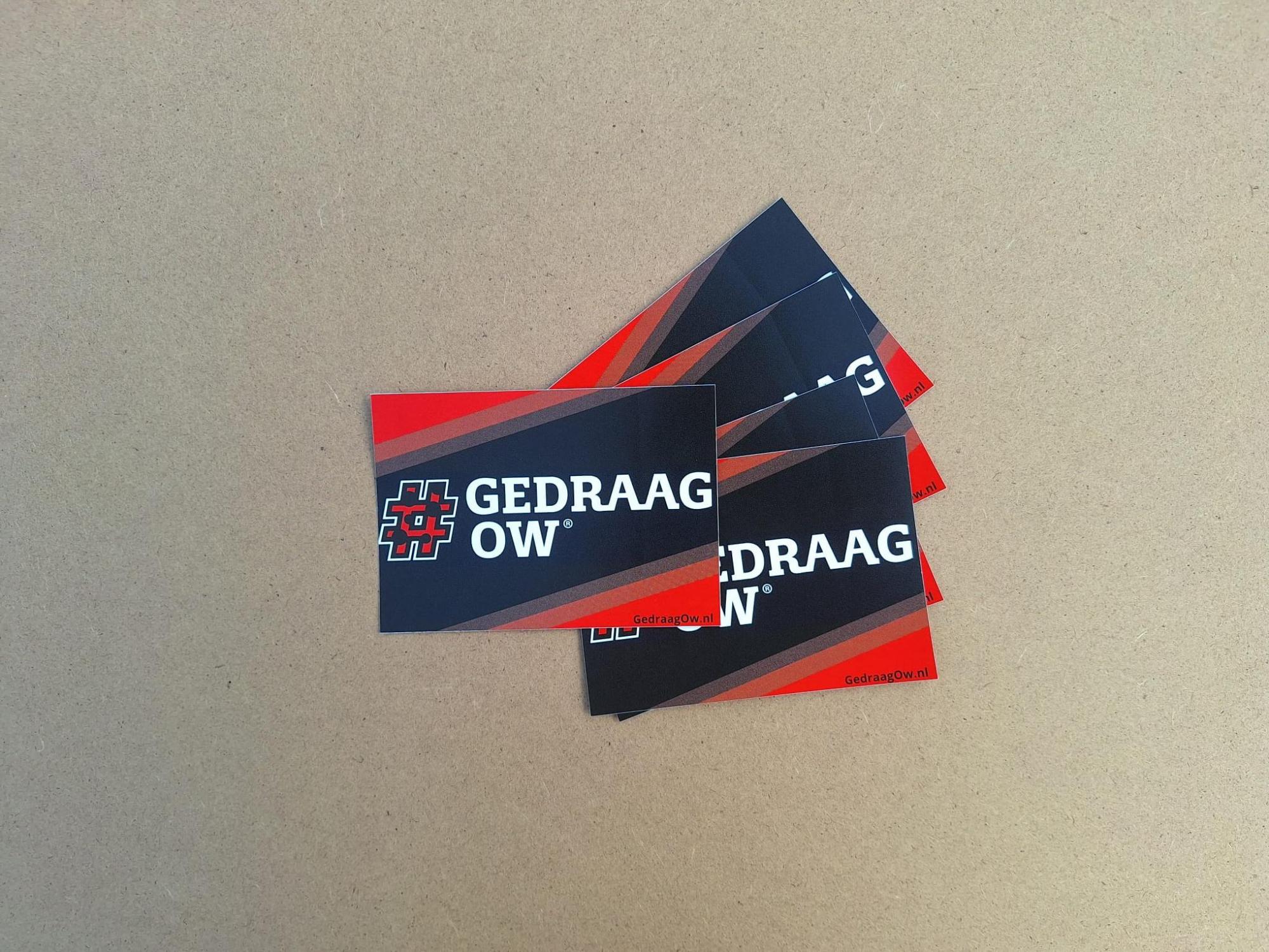 Een stapel van 100 rechthoekige #GedraagOw stickers
