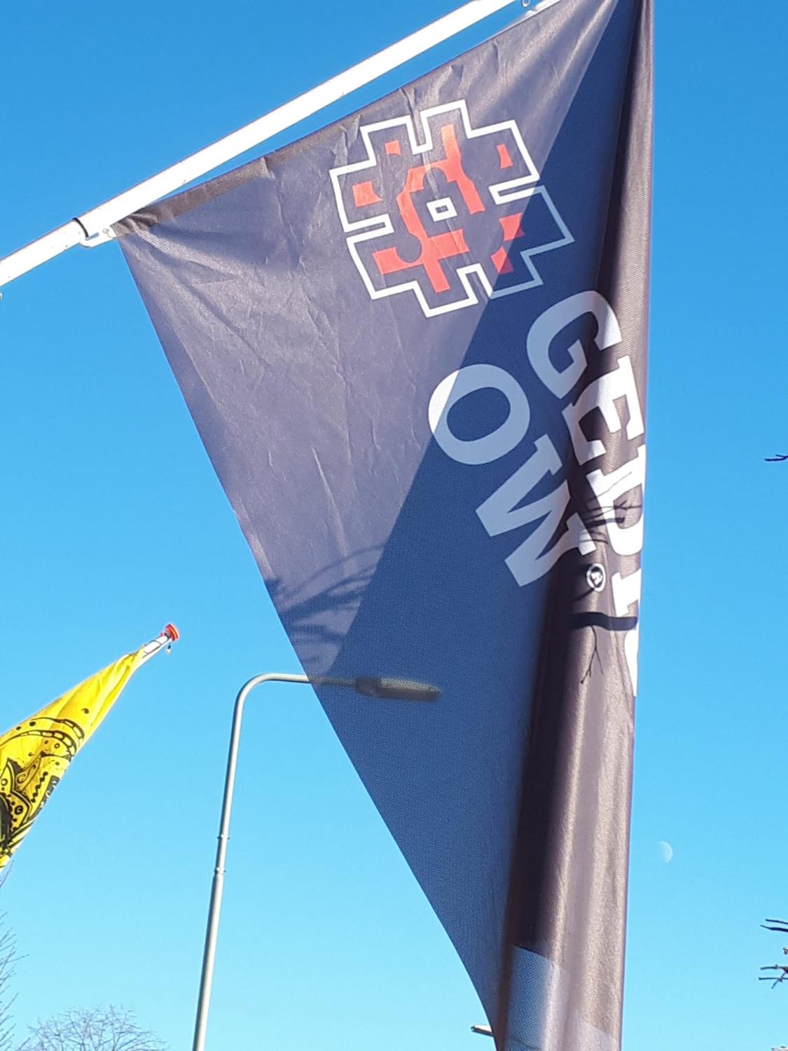 Een vlag met #GedraagOw voorzien van band, koord en lus.Formaat: 100*150cm