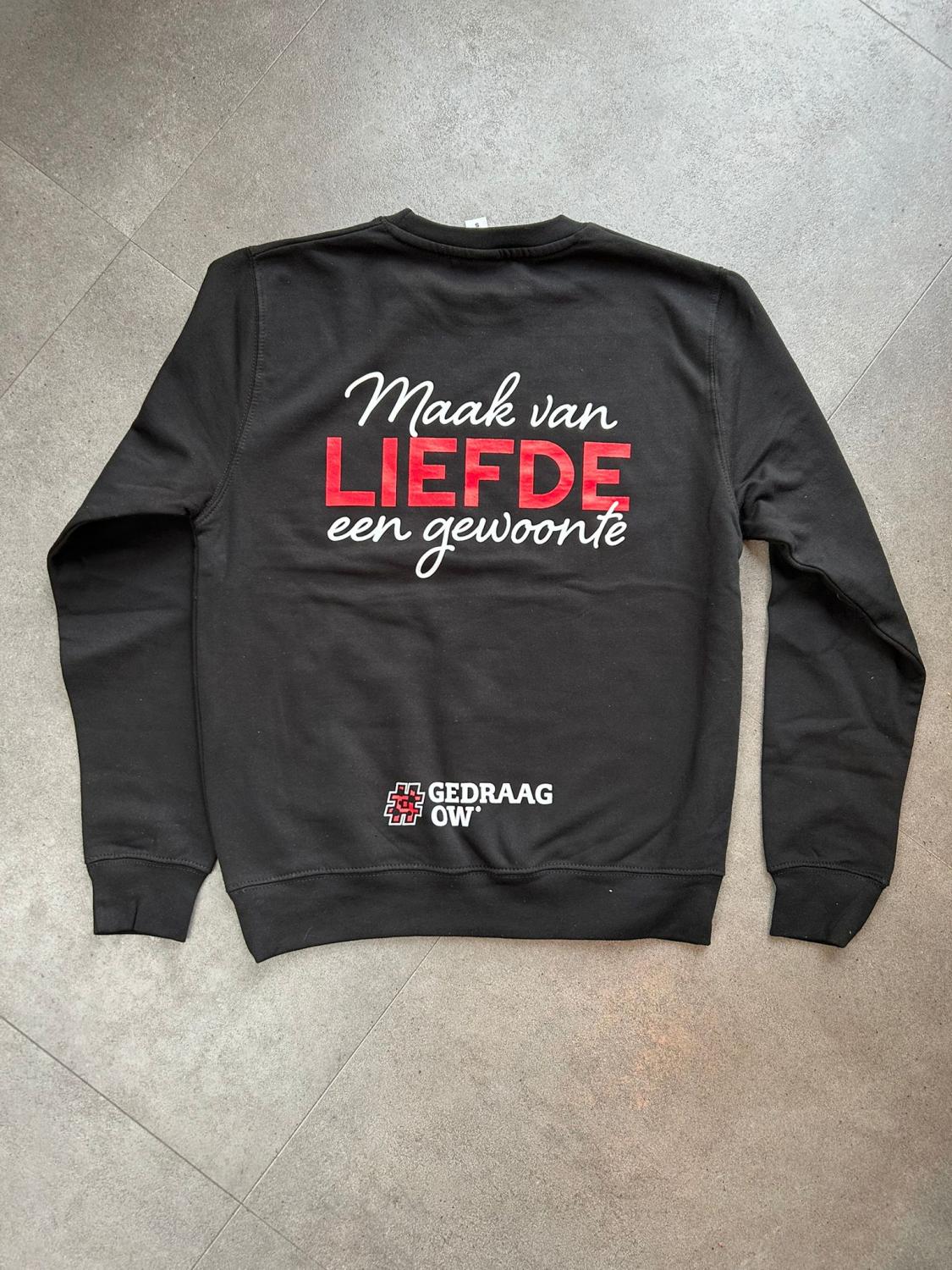 Een unisex sweater met het #GedraagOw logo groot op de achterkant en in het klein op de borst.